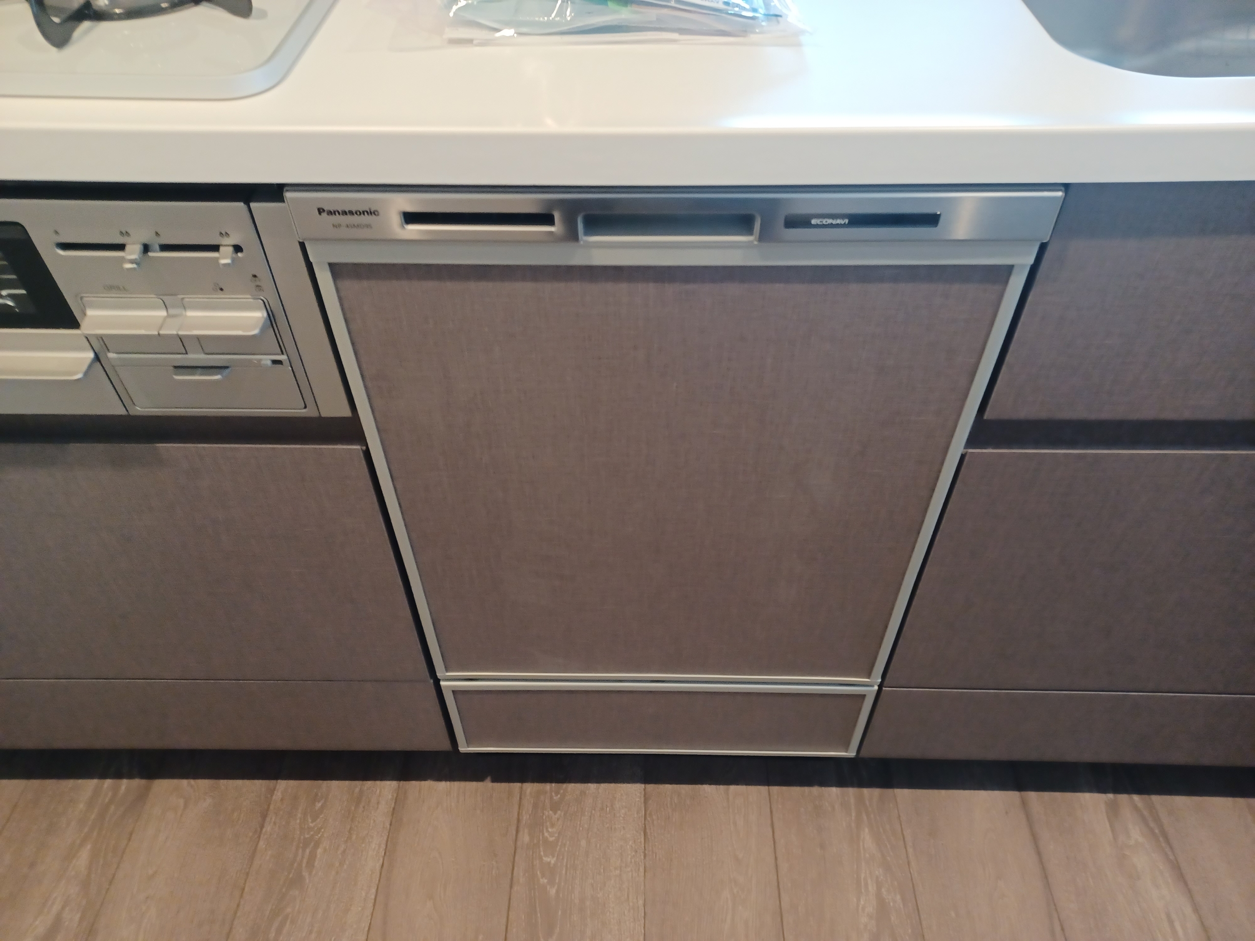 キッチンキャビネット45センチからPanasonic製食器洗い乾燥機 NP-45MD9Sの新規工事 ドアパネルはアイカ JI-877KS22